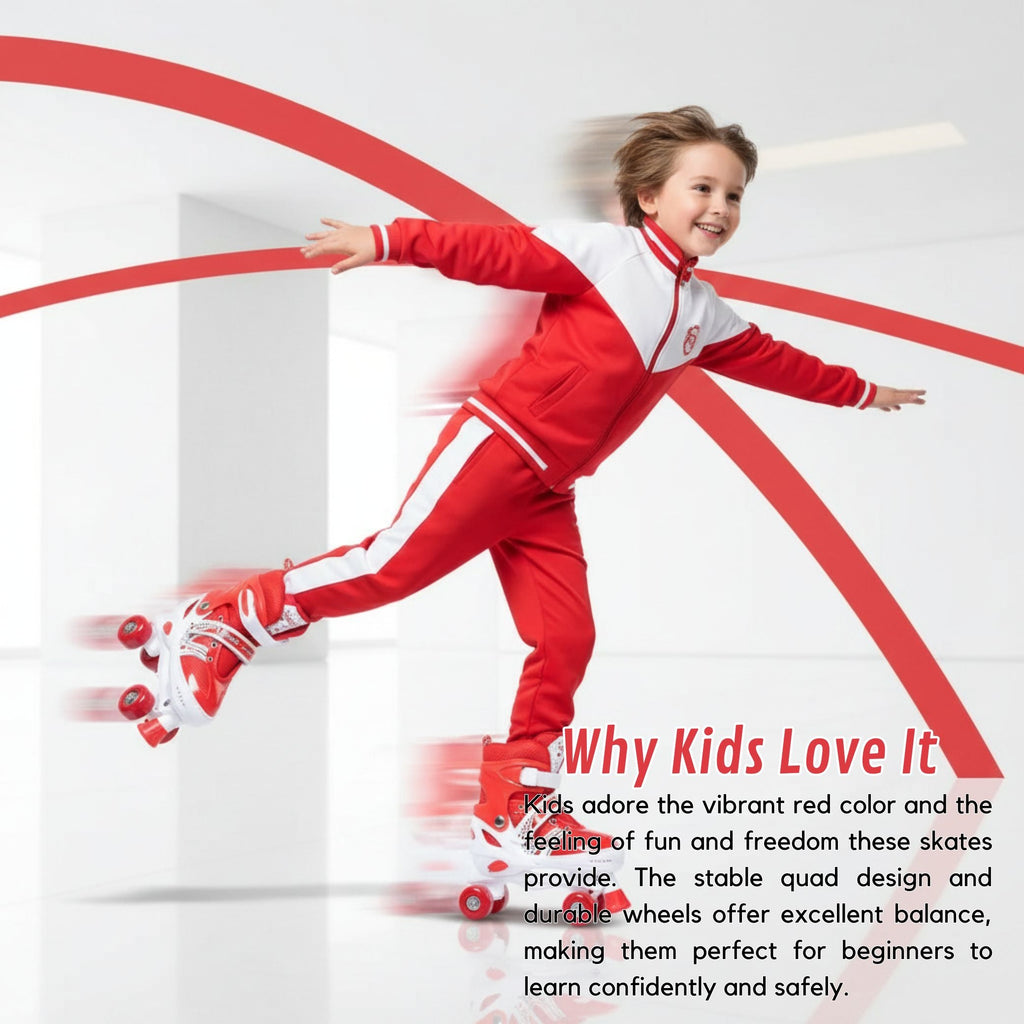 Experience ultimate skating fun with the Power Superb Adjustable Roller Skate Shoes in a bold red color! Designed with a 2-row, 4-wheel configuration, these skates provide superior balance, making them great for both beginners and experienced riders.